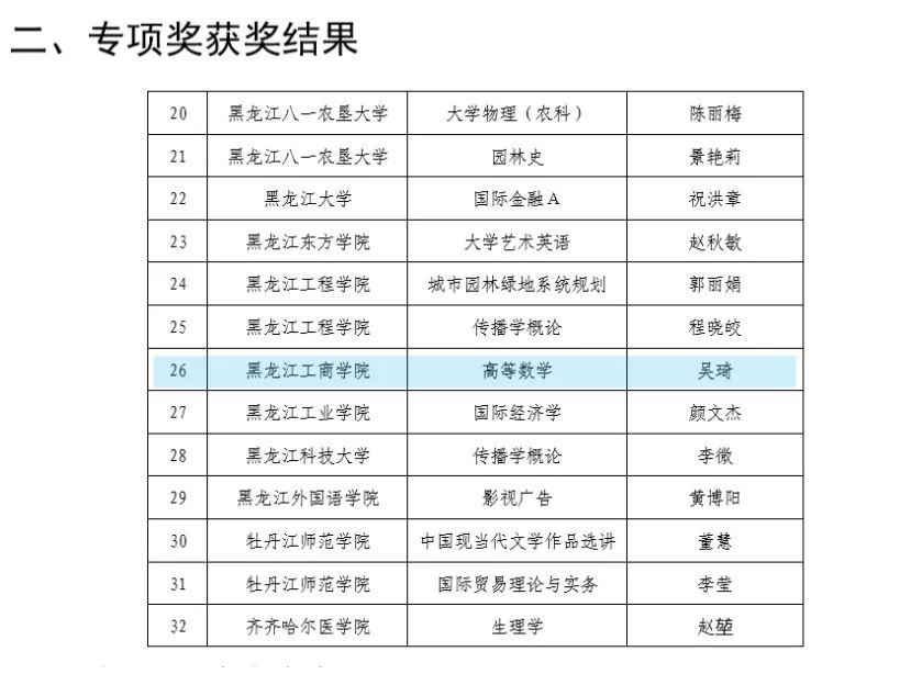 日前,由黑龙江省教育厅举办的“黑龙江省首届高等学校课程思政教学竞赛”落下帷幕。我校通识教育部吴琦副教授讲授的《高等数学》课程荣获“本科赛道”一等奖和优秀教学设计案例奖,这也是全省民办高校在该组别中获得的唯一一个一等奖。